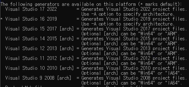 위 명령어를 통해 cmake가 지원하는 Generator를 확인