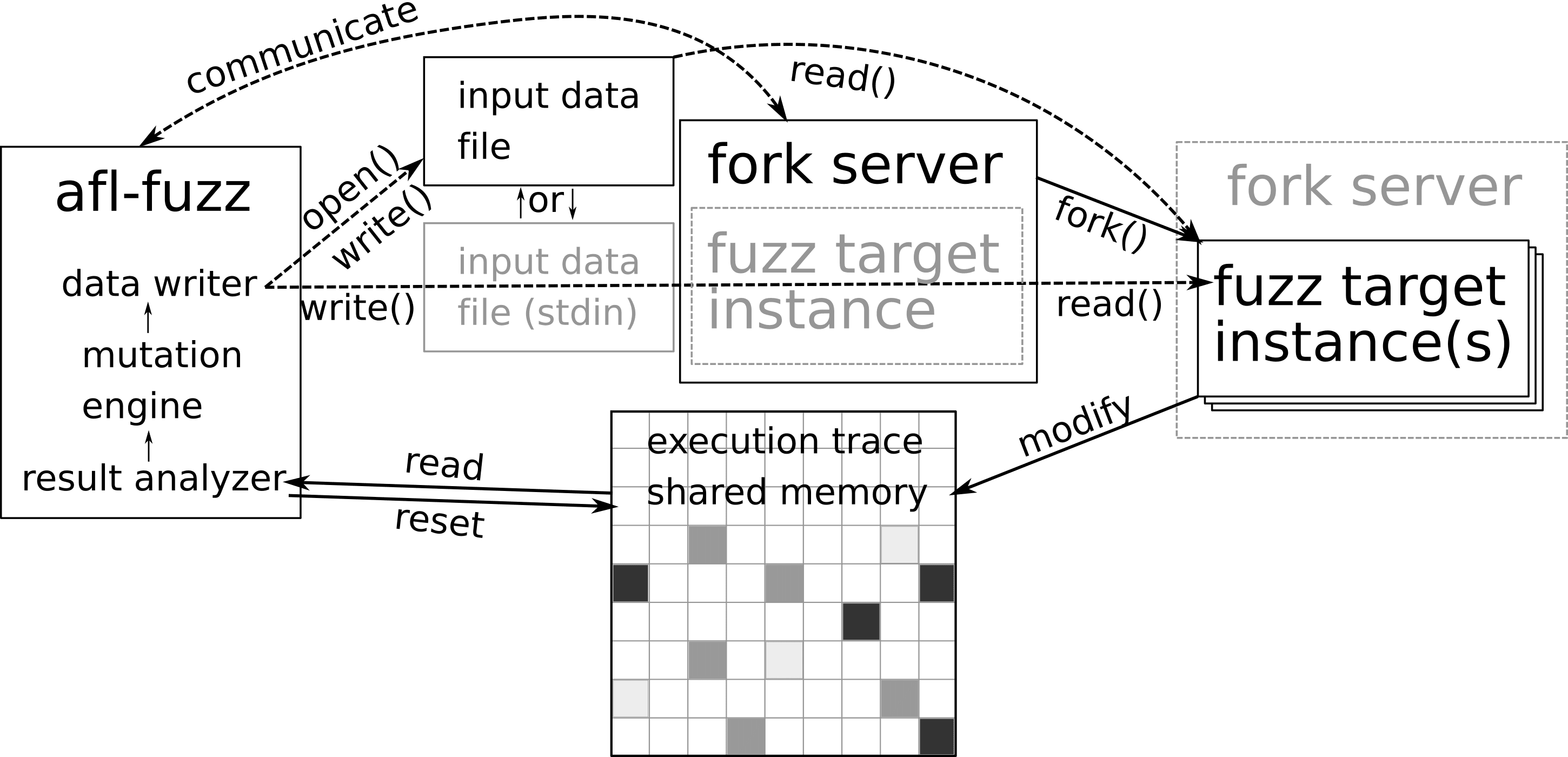 - 해당 프로그램이 처음으로 실행되면서 afl-fuzz와 pipe로 통신을 하면서 fork server를 만들고, 새로운 타겟 인스턴스를 fork call()로 실행한다.