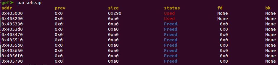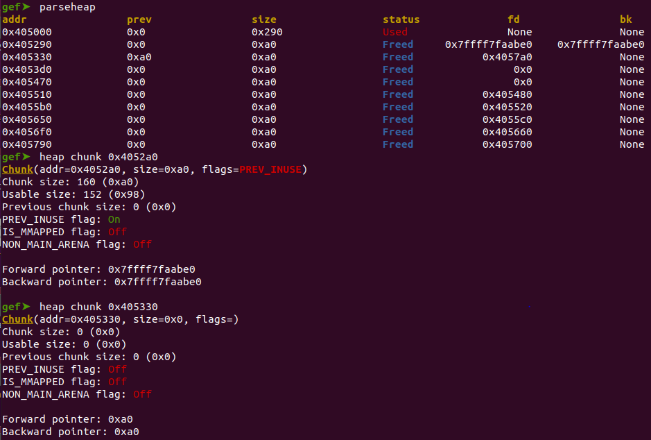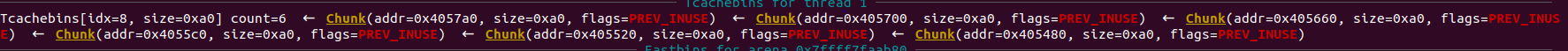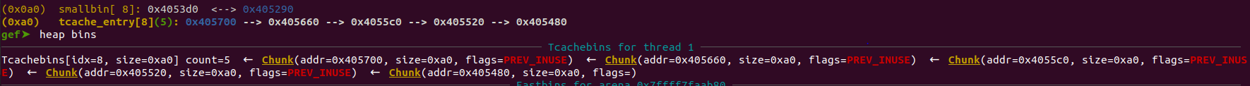 As you can see, chunk1 & [chunk3,chunk8] are put into tcache bins while chunk0 and chunk2 will be put into unsorted bin.