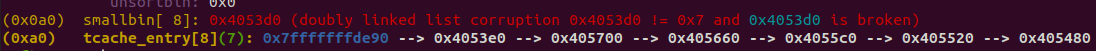 이제 fake chunk가 tcache bin[0xa0] 목록에 들어갔습니다. fake chunk의 fd 포인터가 다음 free chunk를 가리키고 있습니다: 0x55e2270983e0. bck->fd가 libc addr: 0x7f00a7227c70으로 변경되었습니다.